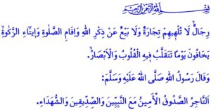 “Ata janë njerëz që nuk i pengon as tregtia e largët e as shitblerja në vend për ta përmendur All-llahun, për ta falur namazin dhe për ta dhënë zeqatin, ata i frikësohen një dite kur do të tronditen zemrat dhe shikimet”.[v]