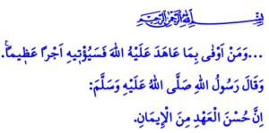 Të nderuar vëllezër dhe motra, duke shpresuar që pyetjeve të mësipërme t’u japim përgjigje pozitive, hutben e kësaj xhumaje dua ta përmbyll duke përcjellur hadithin e Pejgamberit a.s.: لَا إِيمَانَ لِمَنْ لَا أَمَانَةَ لَهُ، وَلَا دِينَ لِمَنْ لَا عَهْدَ لَهُ “Nuk ka besim ai që nuk e ruan amanetin dhe nuk ka fe ai që nuk ka besnikëri”.[4]