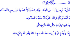 “Ti lexo atë që po të shpallet nga libri (Kurani), fal namazin, vërtet namazi largon nga të shëmtuarat dhe të irrituarat, e përmendja e Allahut është më e madhja (e adhurimeve); Allahu e di ç’punoni ju”.[8]