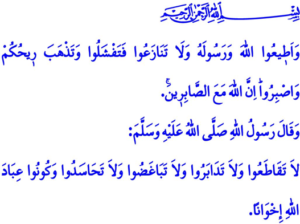 Në ajetin e sipërcituar, Zoti i Plotfuqishëm (sët) thotë: “Bindjuni Allahut dhe të Dërguarit të Tij dhe mos u grindni ndërmjet jush, sepse do të humbni guximin dhe do t’ju lërë fuqia. Bëhuni të durueshëm, se Allahu, me të vërtetë, është me durimtarët.”1