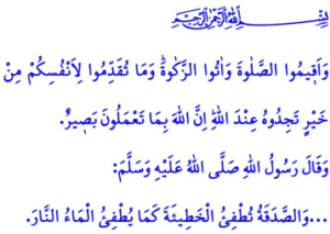 “Faleni namazin dhe jepeni zekatin! Çfarëdo të mire që të bëni për shpirtin tuaj, do ta gjeni tek Allahu. Në të vërtetë, Ai sheh mirë gjithçka që bëni!”.[5]